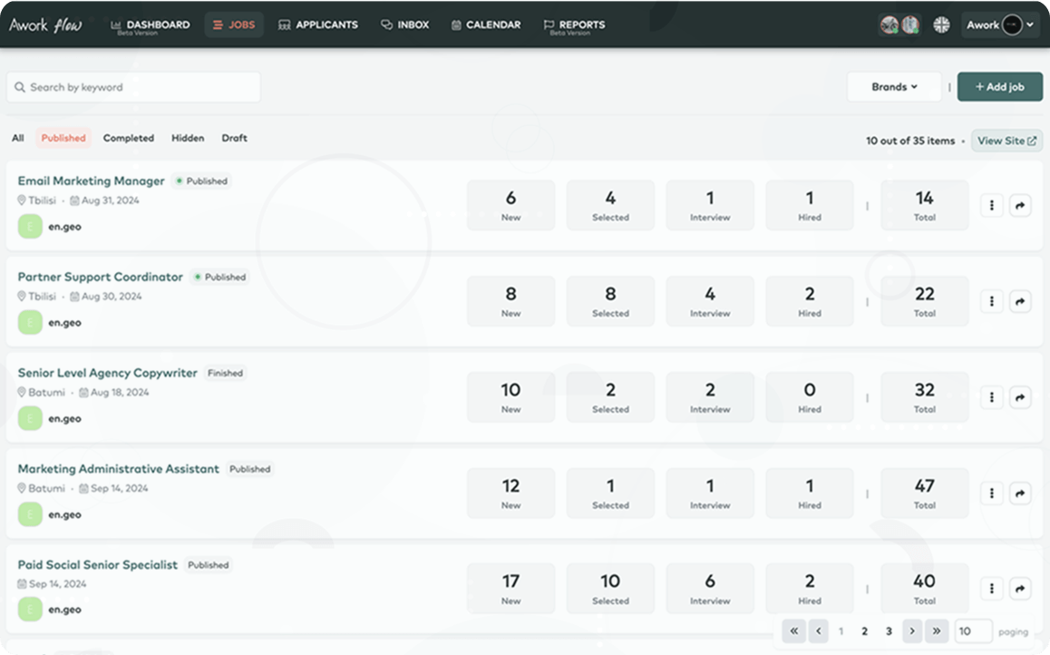 Take a look at Awork Flow to see various visually designed to be intuitive and user-friendly, ensuring that your recruitment process is streamlined effectively from start to finish. Our modules cover every aspect of the recruitment cycle.